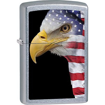 Zippo Windproof Metal Design Fire Lighter - Lifetime Refillable, Reusable Lighter for Smokers – Genuine Premium, Durable, Heavy Quality Chrome Finish Case - Bald Eagle Head U.S. Flag on Black Background.