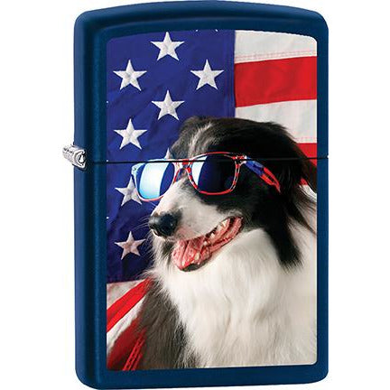 Zippo Windproof Metal Design Fire Lighter - Lifetime Refillable, Reusable Lighter for Smokers – Genuine Premium, Durable, Heavy Quality Chrome Finish Case - Dog Wearing Sunglasses with Flag Background.