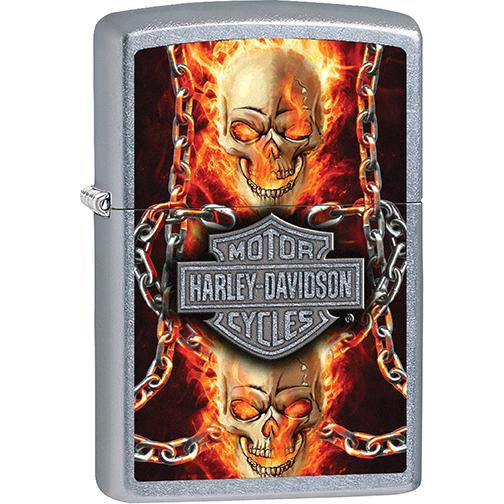 Zippo Windproof Metal Design Fire Lighter - Lifetime Refillable, Reusable Lighter for Smokers – Genuine Premium, Durable, Heavy Quality Chrome Finish Case - Harley-Davidson Chains Flames and Skulls
