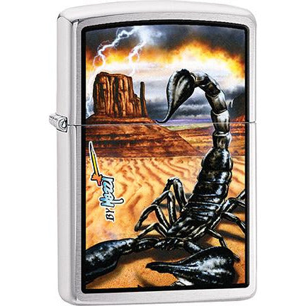 Zippo Windproof Metal Design Fire Lighter - Lifetime Refillable, Reusable Lighter for Smokers – Genuine Premium, Durable, Heavy Quality Chrome Finish Case - Mazzi Scorpion in Desert with Lightning