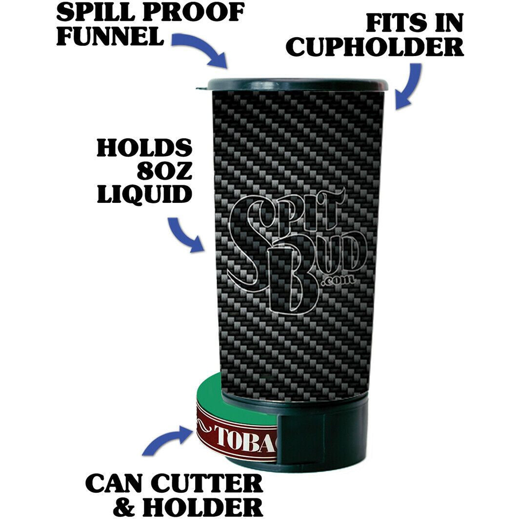 The Spit Bud was designed by engineers to be the most conventional spittoon/spitter for chewing tobacco users on the market. The Spitbud offers more features than any other spittoon. Comes with Can Cutter and Holder. It is the perfect gift for any chewing tobacco user or just treat yourself. Mossy Oak Shadow Design . The Spit Bud was designed by engineers to be the most contemporary spittoon/spitter for chewing tobacco users on the market. Fits in most Car Holder to prevent getting dip spit on your hands when emptying your Spitbud. Convenient pop tab to prevent getting dip spit on your hands when emptying you Spit Bud. . and features a detachable can-cutter. Fits in most cup holders and holds up to eight ounces. Made with a Convenient pop tab The Spit Bud is a spittoon is a spill resistant container that is great f r any chewing tobacco user. The Spit Bud is portable, virtually spill proof, quality double o wall construction.
