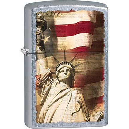 Zippo Windproof Metal Design Fire Lighter - Lifetime Refillable, Reusable Lighter for Smokers – Genuine Premium, Durable, Heavy Quality Chrome Finish Case - Statue Of Liberty & U.S. Flag