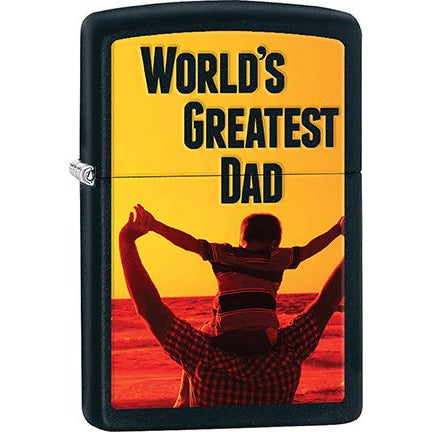 Zippo Windproof Metal Design Fire Lighter - Lifetime Refillable, Reusable Lighter for Smokers – Genuine Premium, Durable, Heavy Quality Chrome Finish Case - "World's Greatest Dad" on Yellow & Red Background.